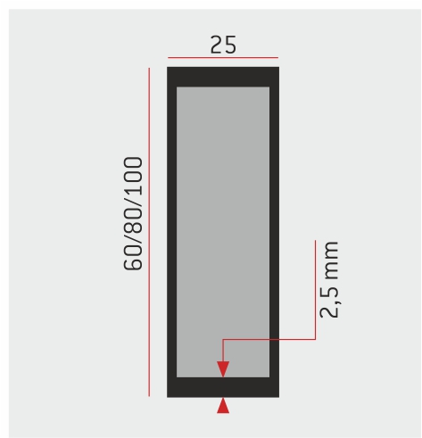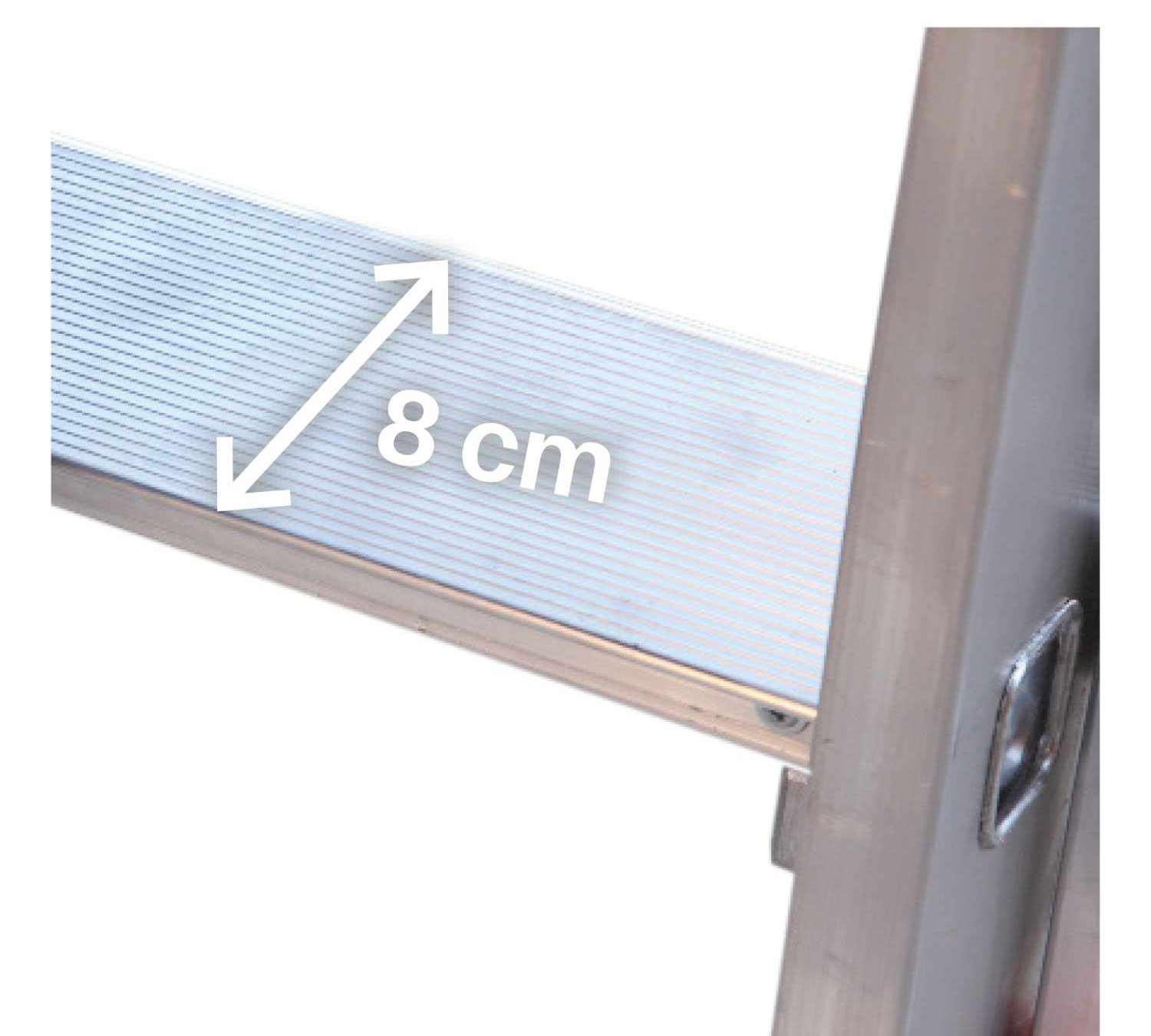 Podłużnice drabiny wykonane zostały z wytrzymałych, zamkniętych profili aluminiowych o przekroju 80 i 100 x 25 mm, dodatkowo boki wzmocnione 2,5 mm. Jakość użytego do tego materiału gwarantuje dużą sztywność i trwałość drabiny.