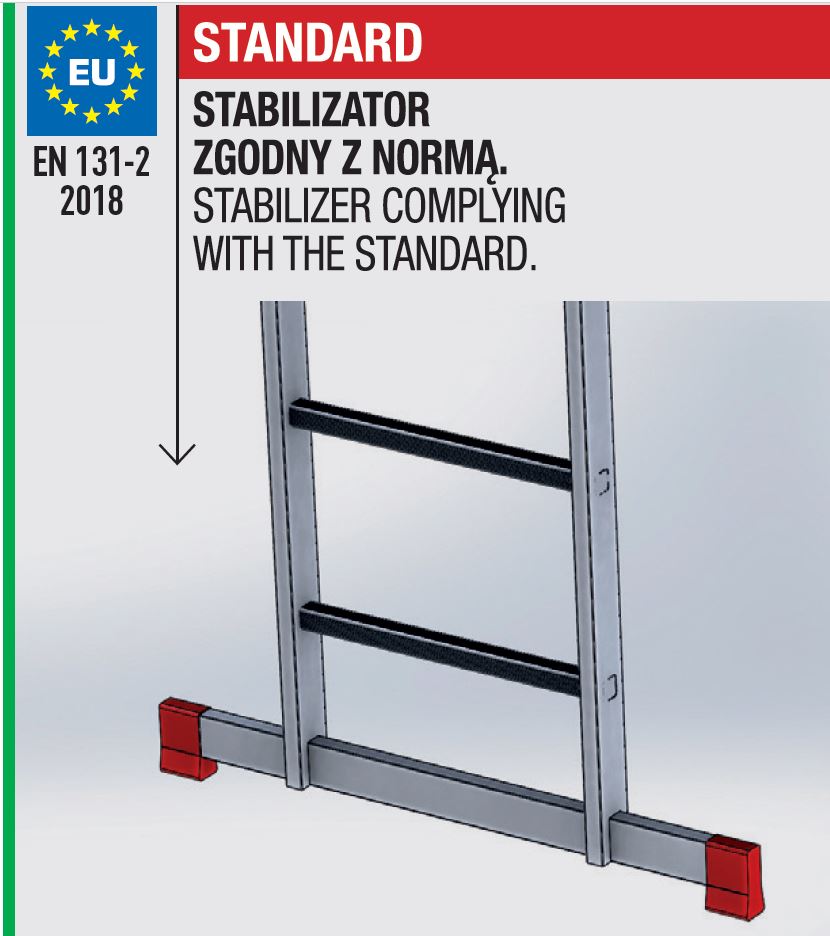 Drabina posiada odpowiednio trwały stabilizator ze stopkami z antypoślizgowego tworzywa zapewniający stabilne oparcie drabiny w czasie pracy.